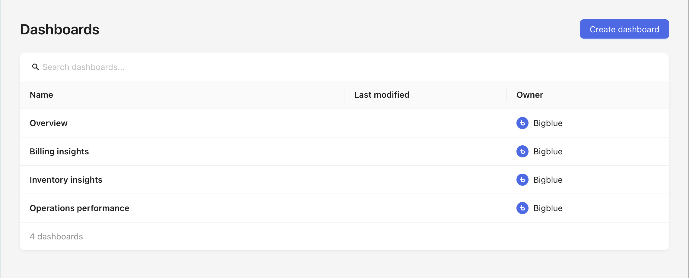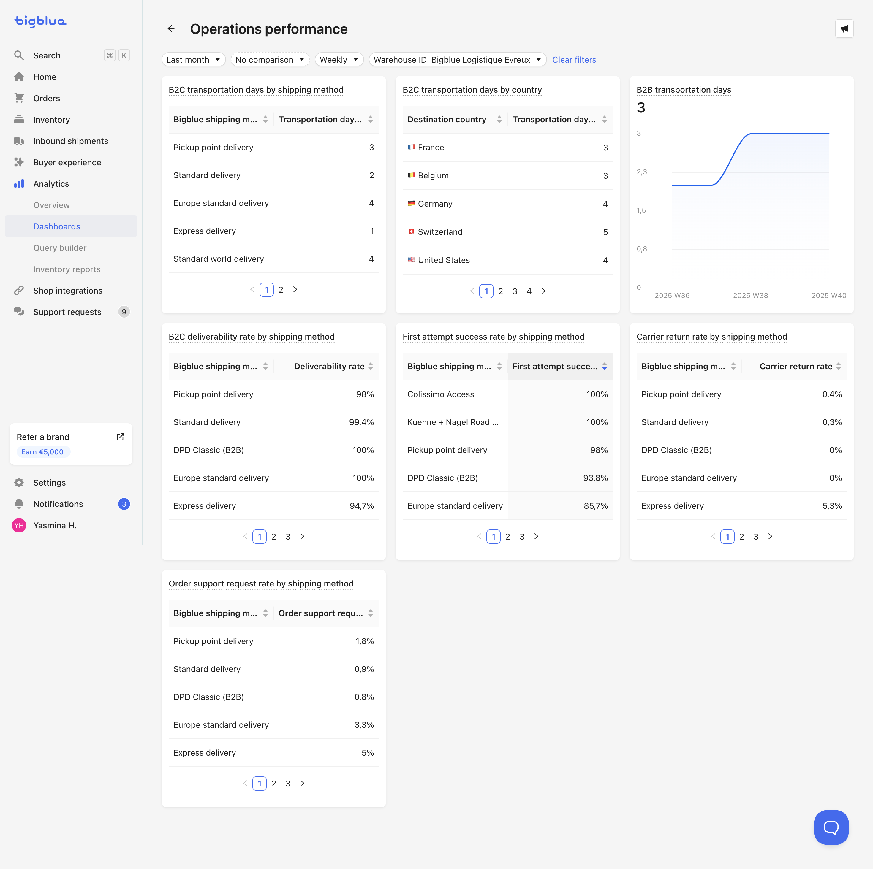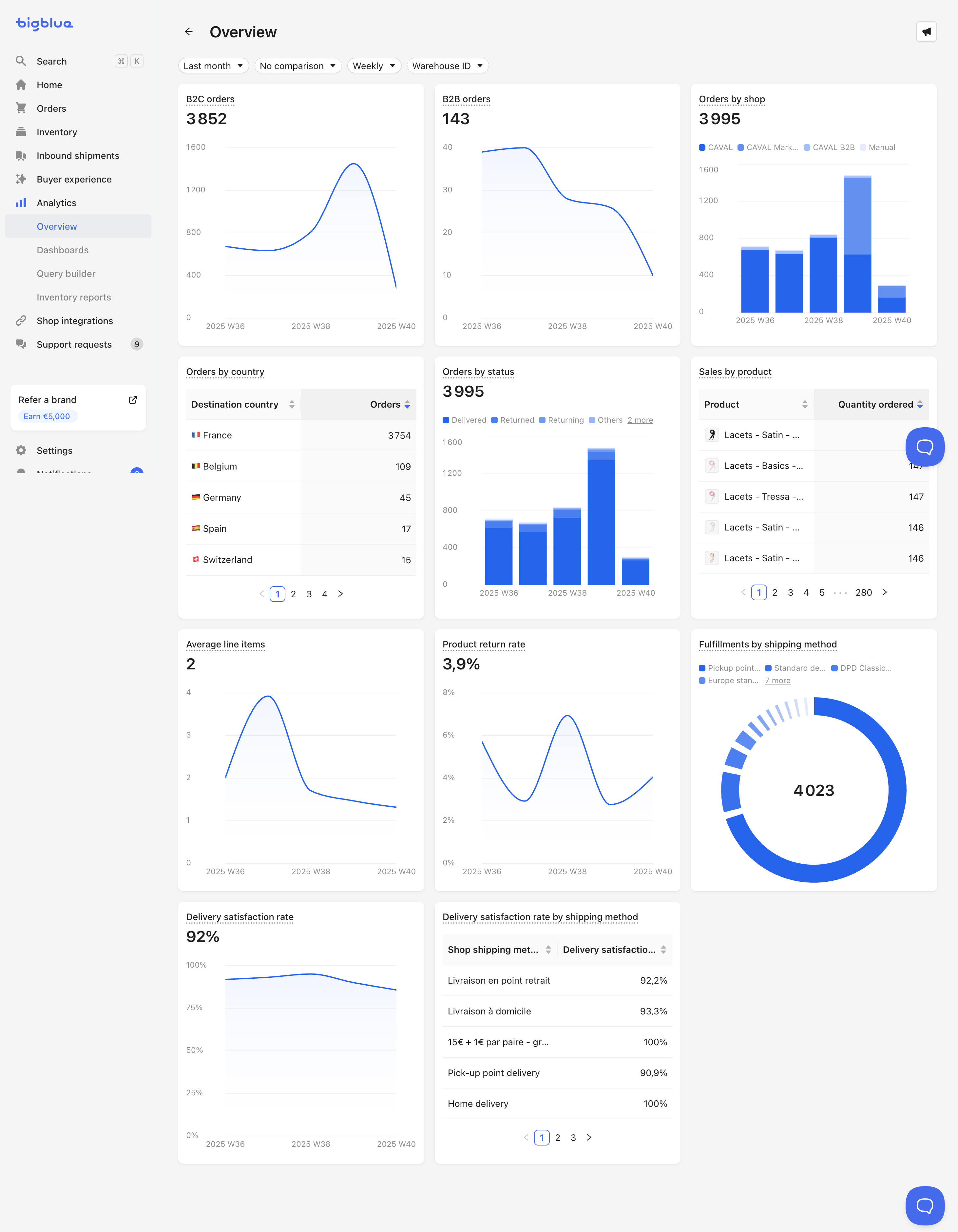 Bigblue proporciona cuadros de mando preconfigurados para ayudar a los comerciantes a supervisar las principales métricas empresariales, logísticas y operativas de un vistazo. Los paneles disponibles son: