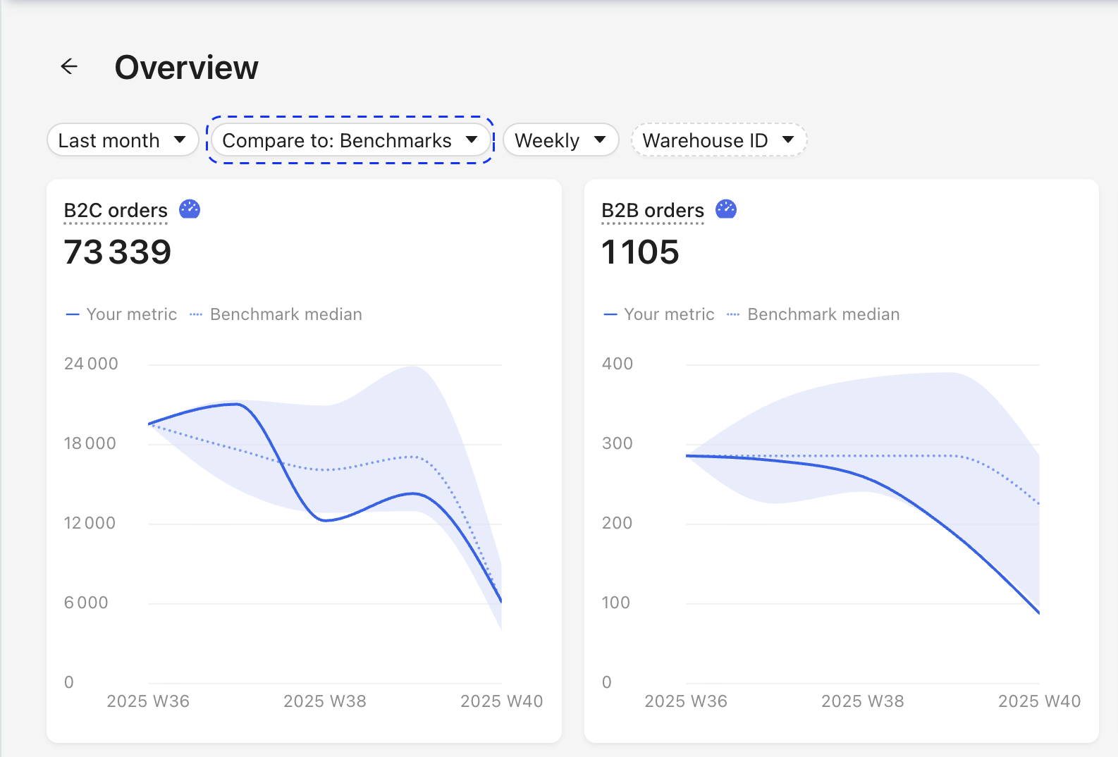 La función de comparación Benchmark le permite contextualizar su rendimiento comparando sus propias tendencias de pedidos con las de otros comerciantes que operan en la misma zona geográfica.