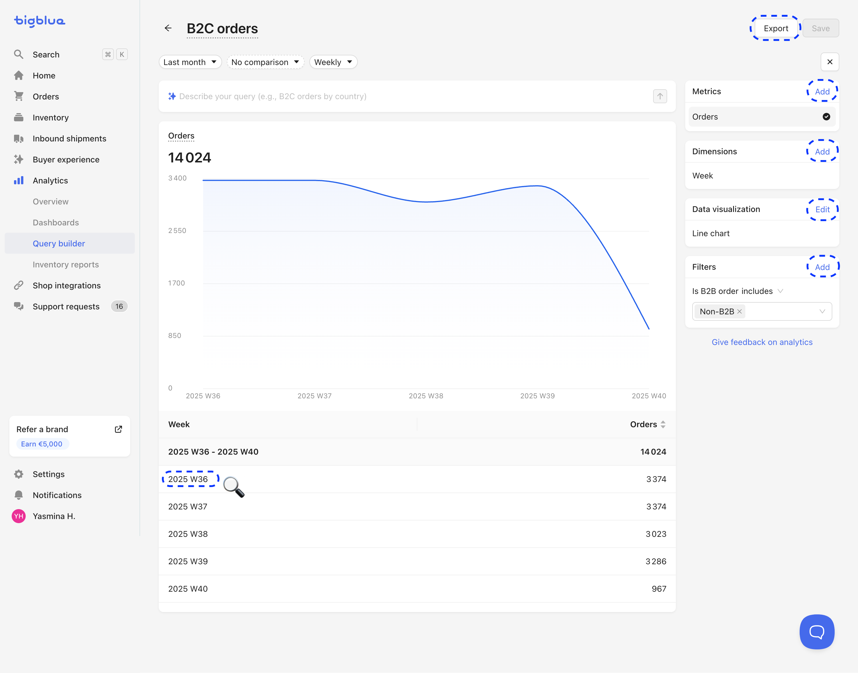 - Desglose para ver los datos subyacentes, por ejemplo, los pedidos individuales, las devoluciones o los registros de fulfillment detrás de una métrica determinada.